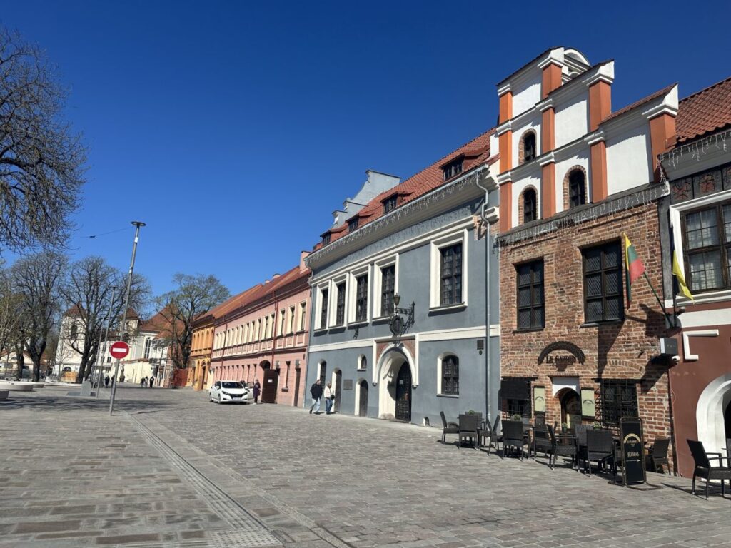 Die Altstadt von Kaunas befindet sich im Osten der Stadt kurz vor der Konfluenz, also dem Zusammenfluss der beiden Flüsse Neris und Nemunas. Rund um den Rathausplatz findest du kopfsteingepflasterte Straßen, kleine Cafés und historische Gebäude, die einen authentischen Eindruck vom alten Kaunas vermitteln. Anders als in Vilnius ist die Altstadt hier etwas kompakter und weniger touristisch, was ihr einen angenehmen, entspannten Charakter gibt. Es wirkt einfach nicht so überfüllt und gedrängt und du kannst den Besuch in Ruhe genießen. Überall in der Altstadt reihen sich die historischen Gebäude in verschiedenen Stilen aneinader.