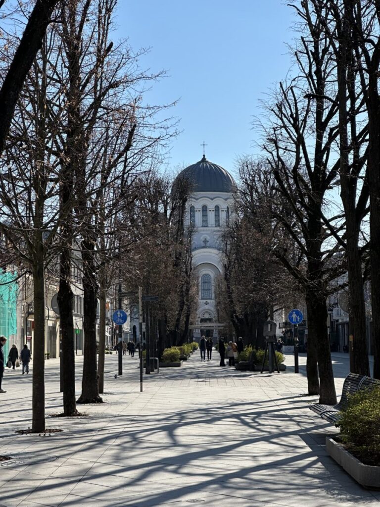 Entlang der breiten Allee findest du zahlreiche Cafés, Restaurants und Geschäfte, die besonders an warmen Tagen gut besucht sind. Gleichzeitig prägen viele Gebäude aus der Zwischenkriegszeit das Bild der Straße, als Kaunas vorübergehend Hauptstadt Litauens war.