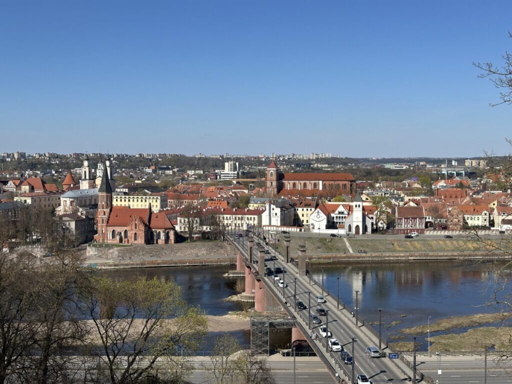 Der Aleksotas Observation Deck bietet einen der besten Ausblicke über Kaunas. Er liegt auf der gegenüberliegenden Seite des Nemunas und ist entweder zu Fuß oder bequem mit einer historischen Standseilbahn erreichbar. Von dort oben hast du einen weiten Blick auf die Altstadt, die Flüsse und die moderne Skyline. Besonders zum Sonnenuntergang ist dieser Ort sehr beliebt, wenn die Dächer der Stadt im warmen Licht leuchten. Um dorthin zu gelangen musst du einmal von der Altstadt den Fluss Nemunas überqueren, und gehst dann rund 50 Höhenmeter auf einen Hügel auf der anderen Flussseite hinauf. Der Blick den du von dort oben auf Kaunas hast ist sehr bekannt und eine der bekanntesten Kaunas Sehenswürdigkeiten.