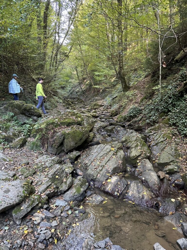 Wenn du genau hinschaust, entdeckst du in der Klamm dunkles, magmatisches Gestein – die sogenannten Diabase. Diese sind vulkanischen Ursprungs und rund 300 Millionen Jahre alt. Da sie viel härter sind als der restliche Sandstein der Grazer Bucht, trotzen sie dem Wasser länger und bilden markante Stellen im Bachbett.